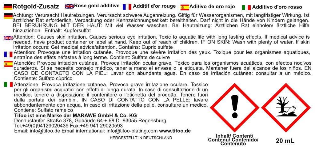 Rotgold-Zusatz für die Verwendung mit den Tifoo Goldelektrolyten "Chamaeleon" oder "Midas" - für die besondere Vergoldung. Das wunderbar rötlich schimmernde Rotgold wird oft im Schmuckdesign verwendet um zum Beispiel Ringen einen Rot-Farbton zu geben. Bekannt ist das Rotgold auch durch das unverwechselbare Aussehen der Krügerrand-Goldmünzen. Mit dem Rotgold-Zusatz können Sie selbst rot vergolden und je nach Mischungsverhätlnis von Goldelektrolyt und Zusatz beeindruckende Farbeffekte erzielen.