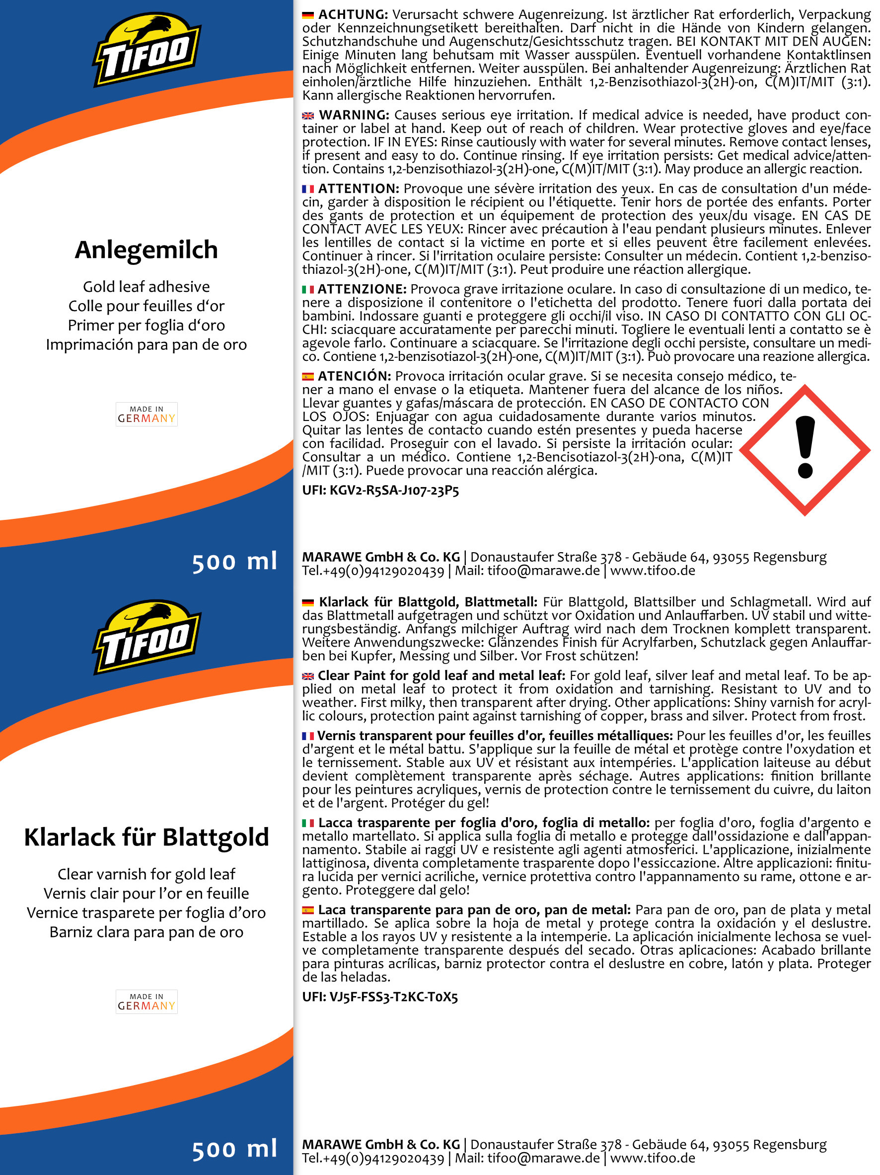 Tifoo Anlegemilch und Klarlack für Blattgold und Schlagmetall (2 x 500 ml) – die Produkteigenschaften auf einen Blick: