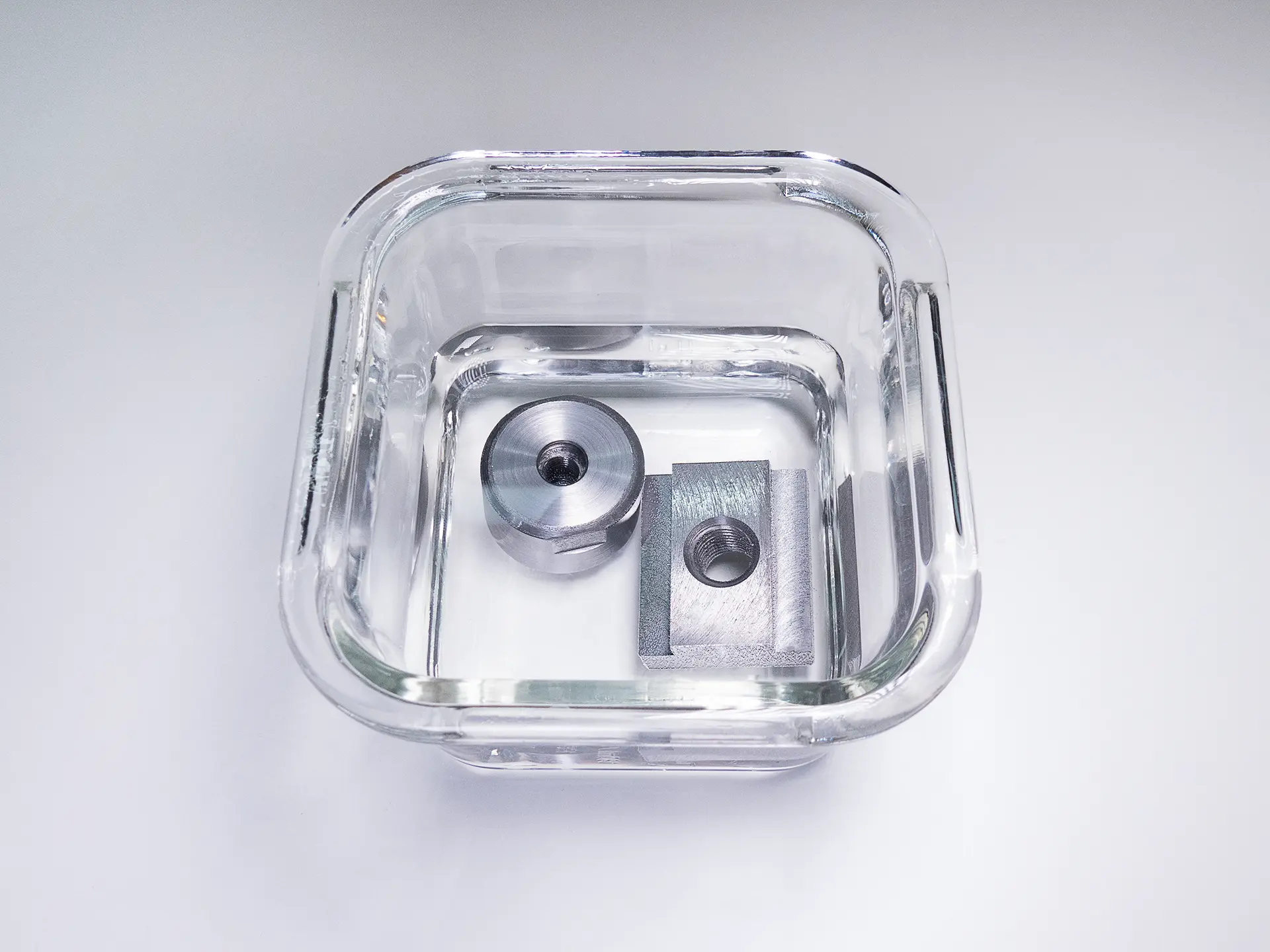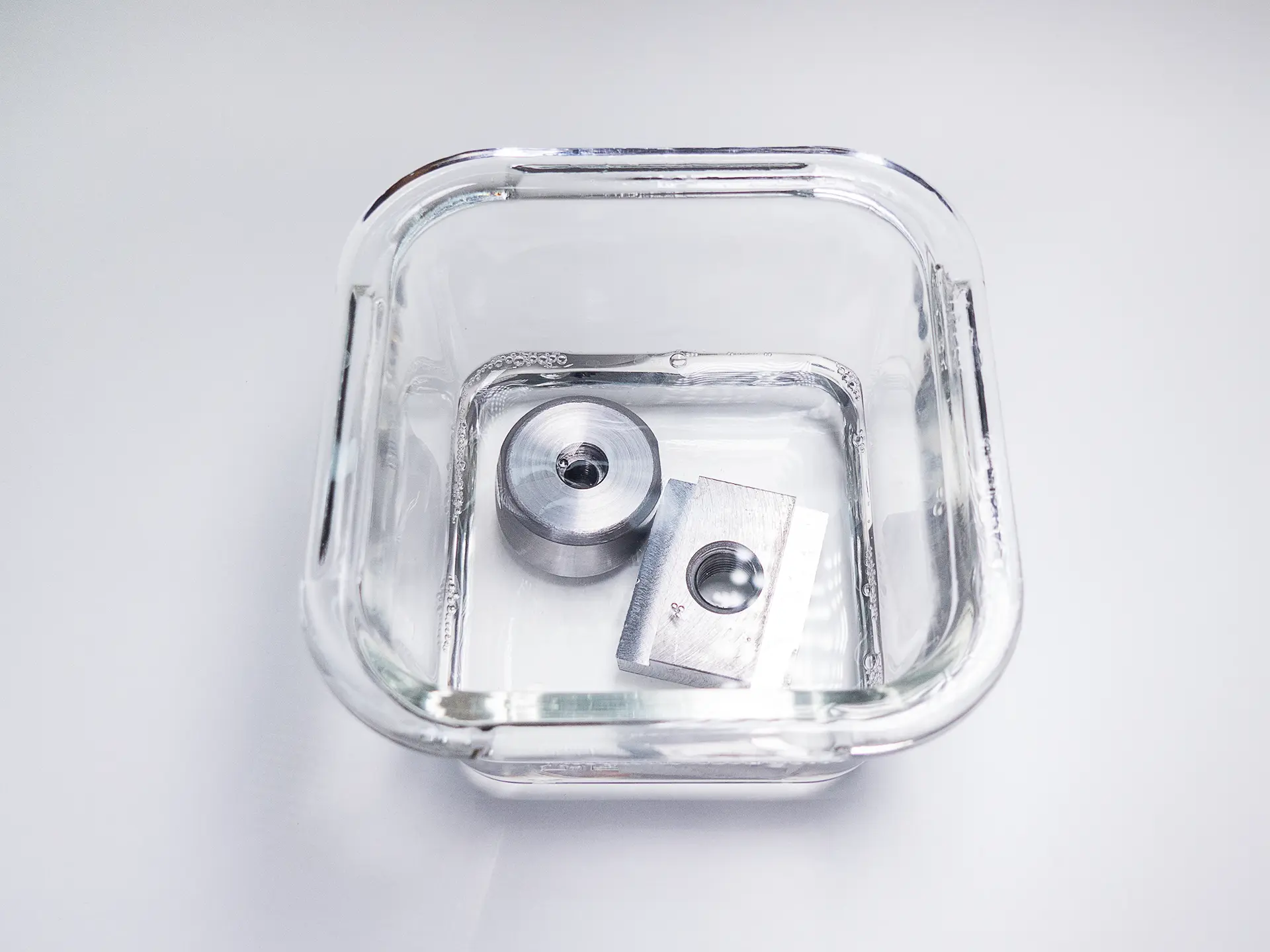 EINÖLEN: Das Einlegen in Komponente IV dient dazu, Wasser aus dem Brünierobjekt zu verdrängen und und die Brünierschicht zu versiegeln. Außerdem werden Reste von Wasser und Brüniermittel entfernt.