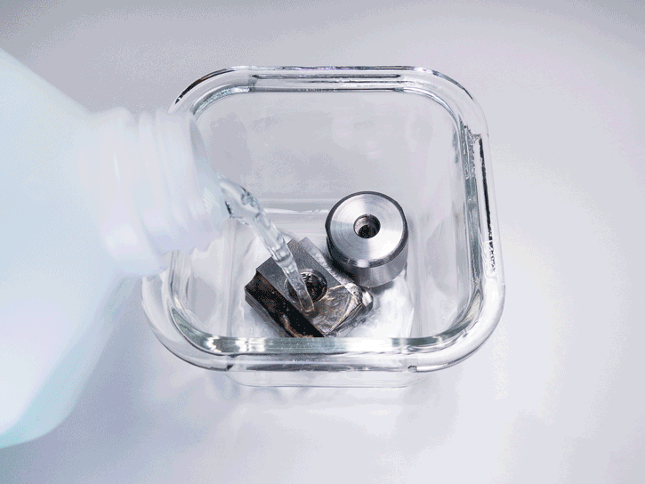 KONDITIONIEREN: Das Werkstück nach Trocknung mit Komponente II behandeln. Das beschleunigt den Brünierprozess und sorgt aufgrund der Oberflächenaktivierung für ein besseres Ergebnis.