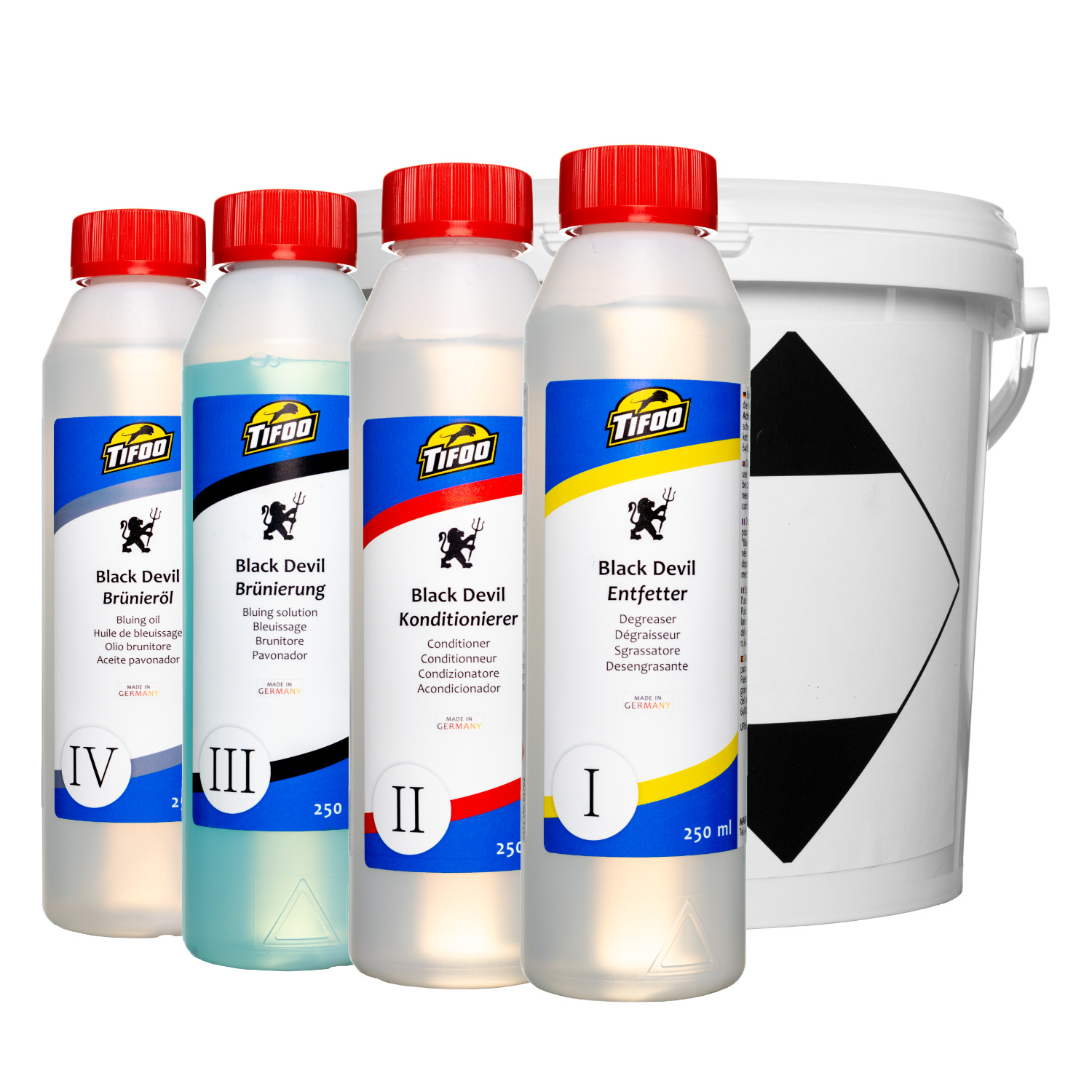 - 5-Komponenten-Set: Entfetter, Konditionierer, Brüniermittel, Brünieröl und praktischer Eimer