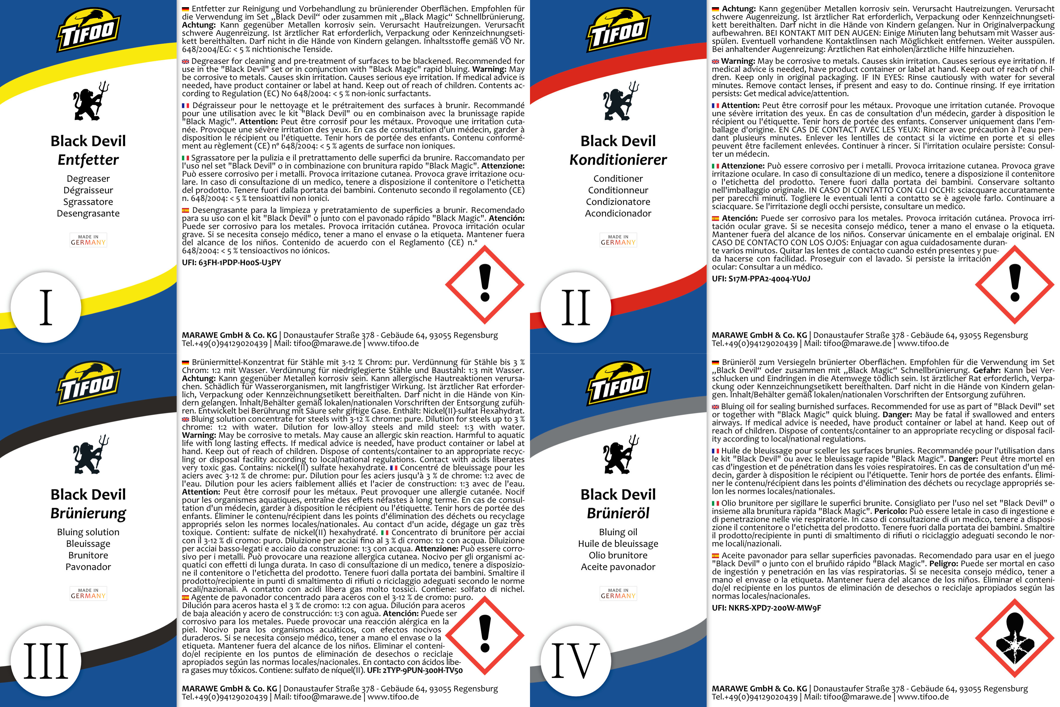 WICHTIG: Die Tifoo Brünierung Black Devil kann nicht eingesetzt werden für: Chrom, Aluminium, Titan, Zinn, Blei, Bismut, oder hochlegierte Stähle wie z.B. Nirosta, V2A oder V4A. Für Aluminium und V2A bieten wir eigene Lösungen an.