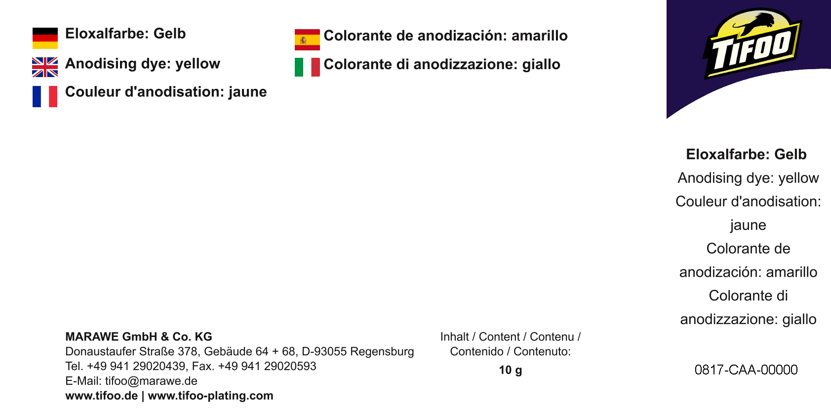 Das Finish für eine gelungene Eloxierung stellt die abschließende Färbung dar. Wir bieten Ihnen hier exklusive Eloxalfarben höchster Qualität. Tifoo Eloxal-Gelb ermöglicht die Einfärbung der Eloxalschichten in verschieden starke Gelbtöne. Rühren Sie den Farbstoff einfach in die gewünschte Menge destilliertes Wasser (an jeder Tankstelle erhältlich) ein.