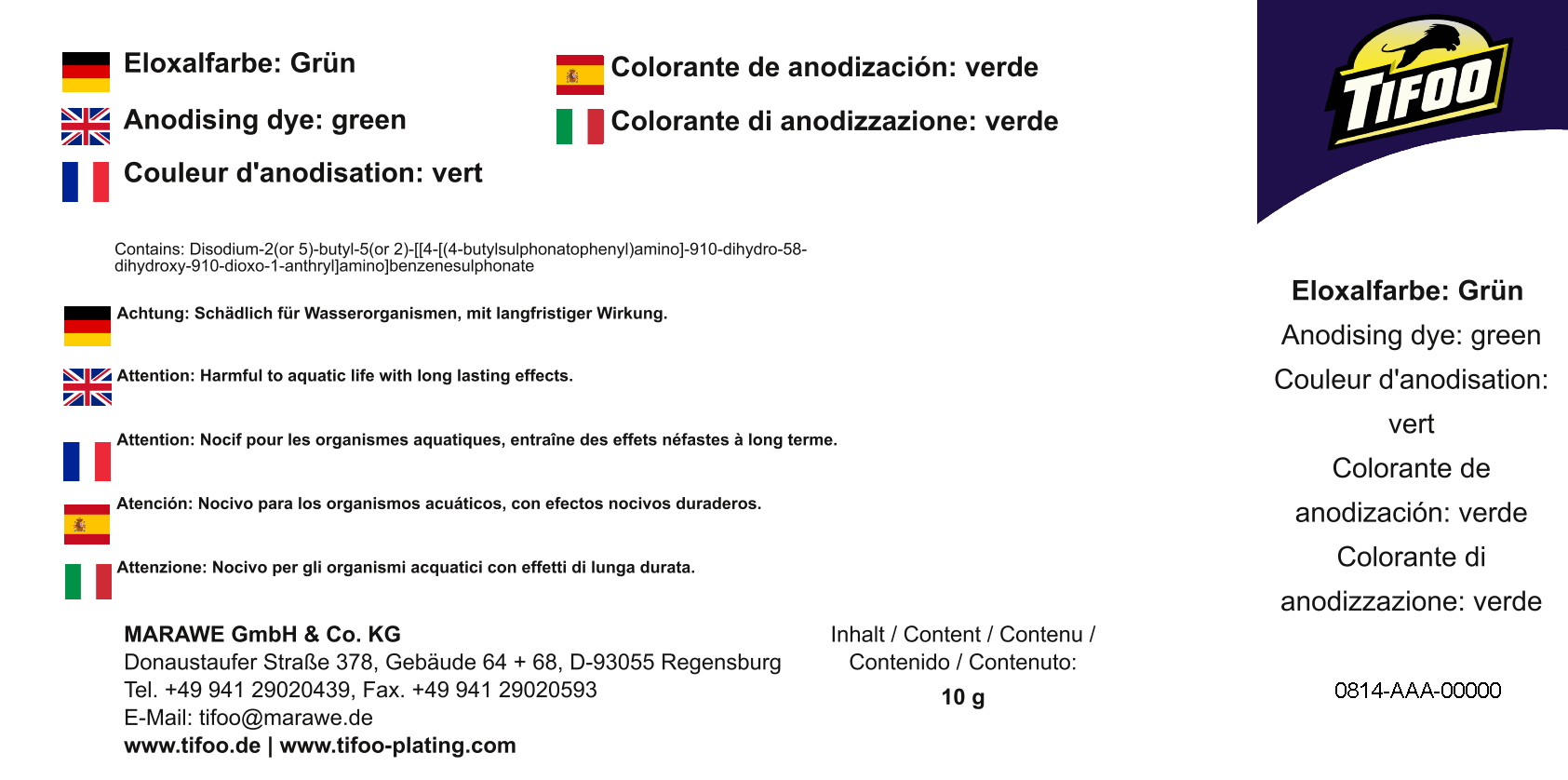 Das Finish für eine gelungene Eloxierung stellt die abschließende Färbung dar. Wir bieten Ihnen hier exklusive Eloxalfarben höchster Qualität. Tifoo Eloxal-Grün ermöglicht die Einfärbung der Eloxalschichten in verschieden starke Grüntöne. Rühren Sie den Farbstoff einfach in die gewünschte Menge destilliertes Wasser (an jeder Tankstelle erhältlich) ein.