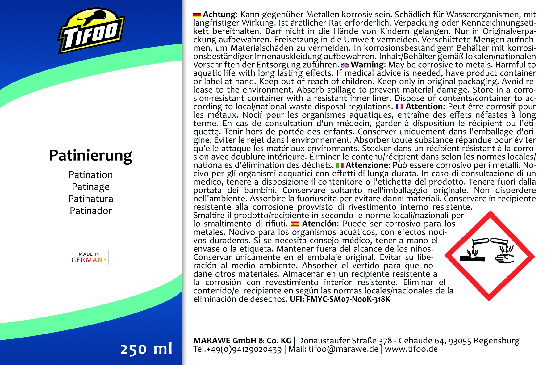 Sie wollen beeindruckende Antik-Effekte und Färbungen auf Kupfer, Messing oder Bronze erzeugen? Dann ist die Tifoo Patinierung genau richtig! Sie können schnell und einfach selbst Kupfer, Messing & Bronze patinieren und das Metall künstlich altern lassen. Egal ob Schrauben, kleine Autoteile, Massenware, unbewegliche bzw. fest verbaute Oberflächen oder Schmuck, alles kann mit der Tifoo Patinierung patiniert werden. Die Patinierung sieht nicht nur gut aus, sondern schützt auch das Material. Das Tifoo Patiniermittel ist ein Konzentrat und kann je nach Verdünnung als Streich- oder Tauchpatinierung verwendet werden. Für Beispiele der erreichbaren Farbnuancen (je nach Verfahren und Einwirkdauer), sehen Sie sich bitte unsere Bilder oder das Produkt-Datenblatt an.