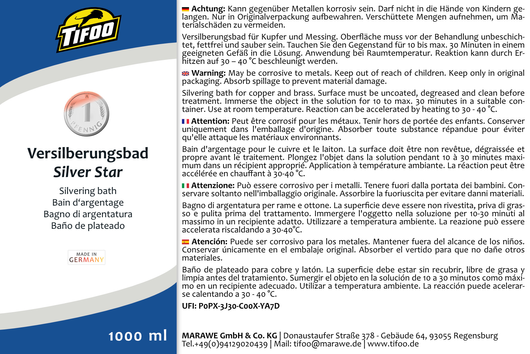 Mit dem Tifoo Silver-Star Versilberungsbad ist das einfache Versilbern von Kupfer und Messing innerhalb weniger Minuten möglich. Mit dem Tifoo Silver-Star ist auch das Nachversilbern und die Restauration von alten Münzen, Ziergegenständen und Kunstobjekten kein Problem. Die Anwendung des Silver-Stars ist denkbar einfach: tauchen Sie den Gegenstand zur Versilberung in ein Bad aus Tifoo-Silver-Star und in kurzer Zeit bildet sich eine fest haftende, glänzende Silberbeschichtung. Idealerweise sollte der Gegenstand den Sie selber versilbern möchten vorher gründlich reinigen und entfetten. Bei Kupfer oder Buntmetallen eignet sich hierfür der Tifoo-Kupferreiniger ganz besonders, welchen Sie natürlich auch in unserem Shop erhalten. Lesen Sie sich vor Gebrauch die Bedienungsanleitung genau durch. Zudem beraten wir Sie jederzeit gerne und stehen Ihnen für Fragen mit unserem Support-Team zur Verfügung.